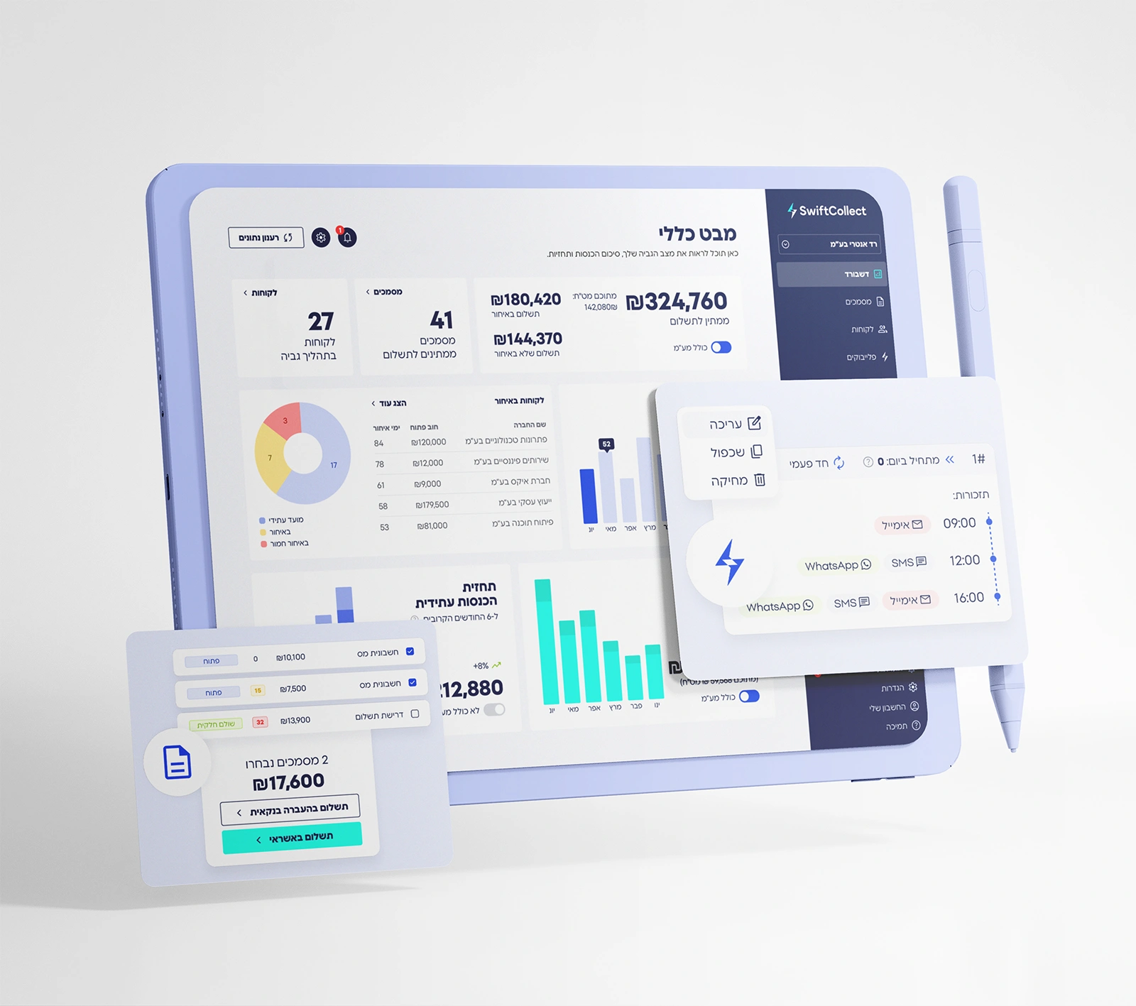מערכת חכמה לאוטומציה של גבייה, שמסנכרנת את כל החשבוניות מהנהלת החשבונות ומנהלת עבור המשתמש תזכורות חכמות בתהליכים אוטומטיים. המערכת מציגה דשבורד ברור למעקב, מאפשרת ניהול לקוחות, עריכת תבנית הודעות לכל ערוץ (Email, SMS, WhatsApp) ושליטה מלאה בהתראות לפי מסמך ולקוח. בנוסף, ניתן להגדיר בקלות תזכורות לזמנים מסויימים, תשלומים והרשאות כך שכל תהליך הגבייה הופך אוטומטי, יעיל ונעים, עם חוויית שימוש מסודרת וברורה.